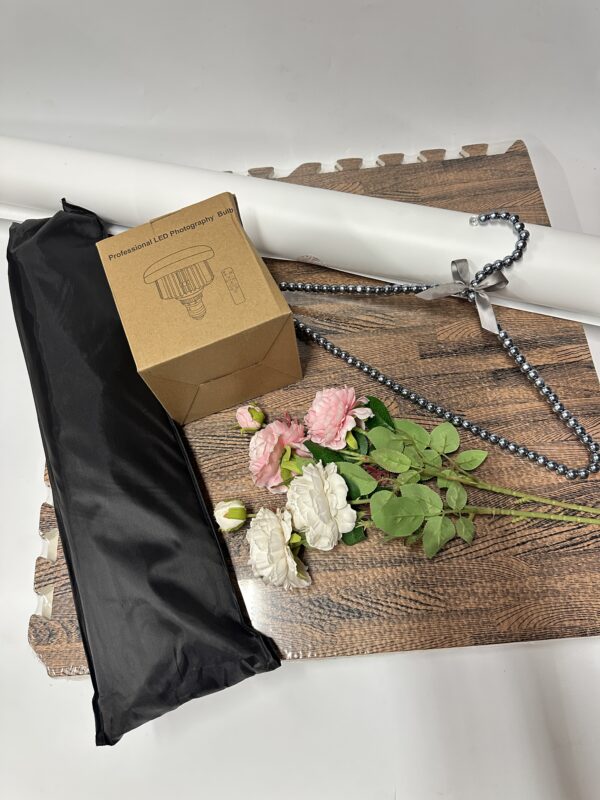 Big PCV backdrop, Foam backdrop, Softbox light, Flowers, Beaded hanger