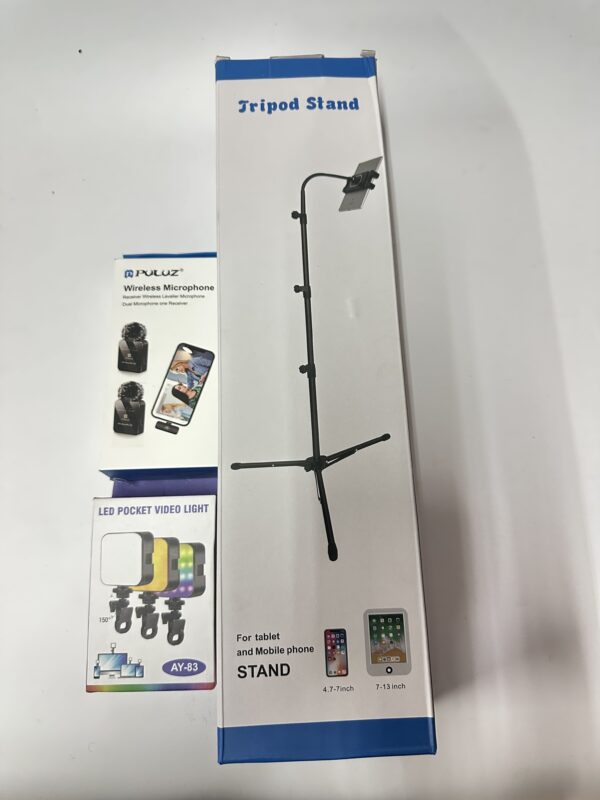 Flexible neck phone tripod, Puluz noise reduction microphone, RGB mini selfie led light