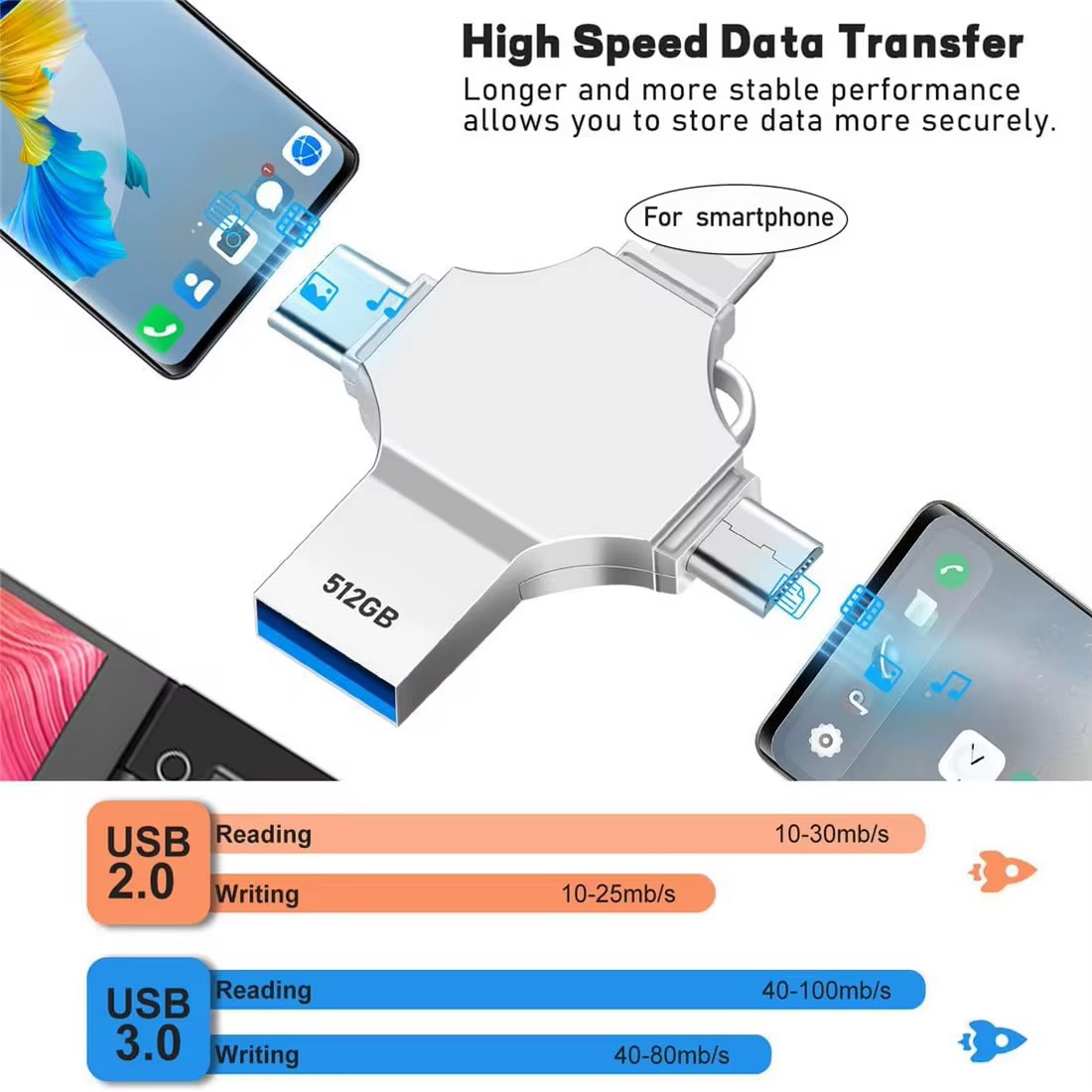 - Direct file transfer from phones to flash drive
